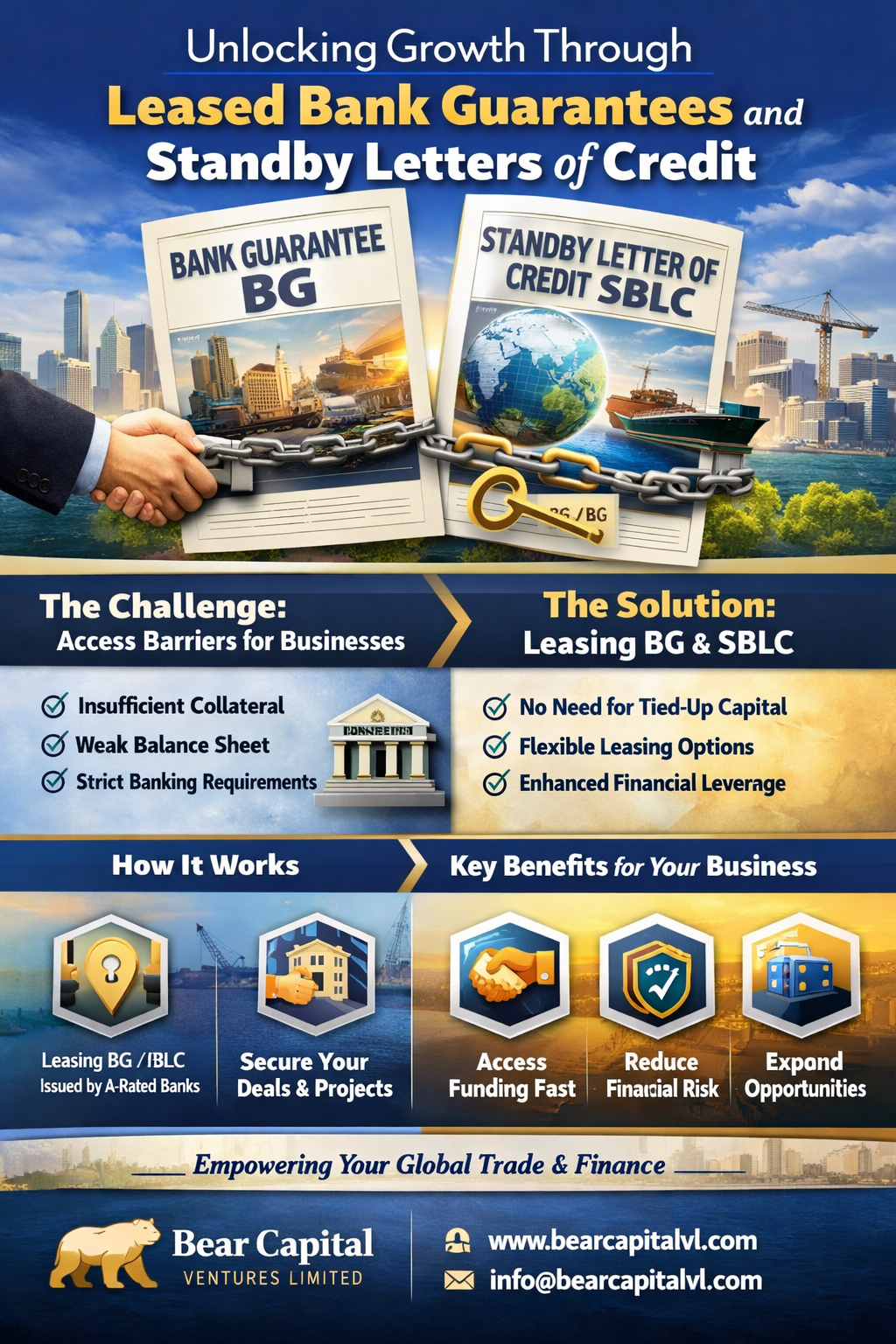Businesses involved in international trade, construction, engineering, procurement, and supply agreements often encounter administrative and structural challenges when arranging banking support for large-scale contracts. Bear Capital Ventures Limiteds expanded advisory services are designed to help clients better prepare for institutional review and meet recognized banking standards.