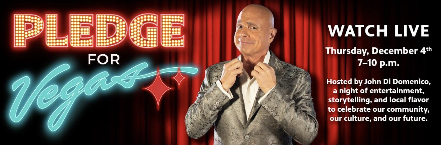 Hosted by entertainer John Di Domenico and veteran Co-host and journalist Maria Silva, Pledge for Vegas reimagines the well-remembered pledge drive with classic Vegas flair, drawing inspiration from Jerry Lewis, Lawrence Welk and Johnny Carson. By combining nostalgia with forward-thinking engagement, this pledge drive will be a national story of resilience and creativity in public media.